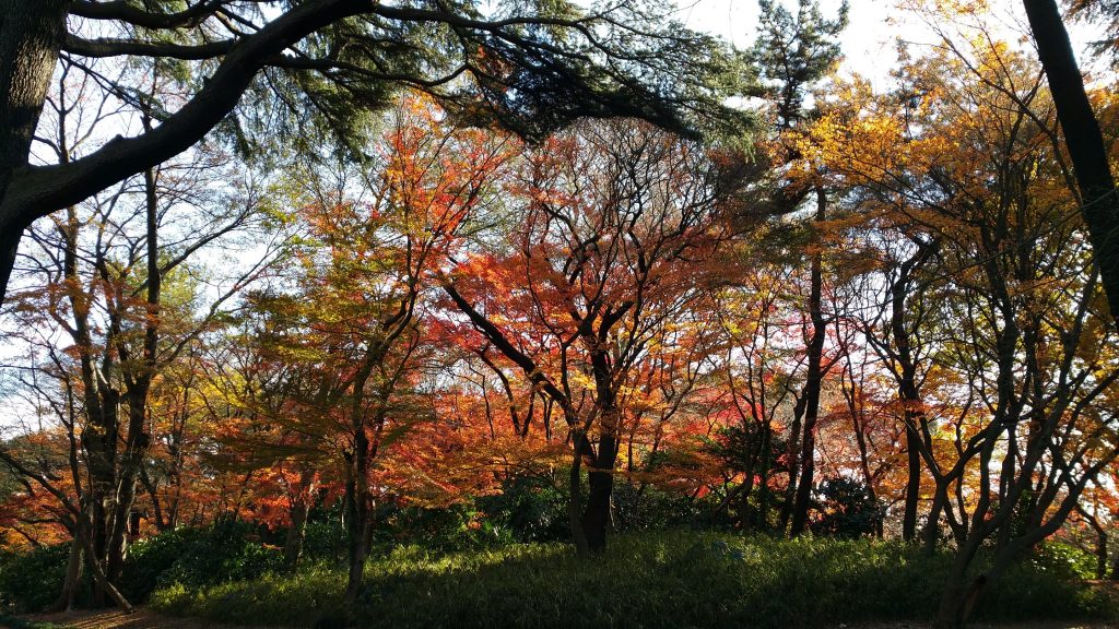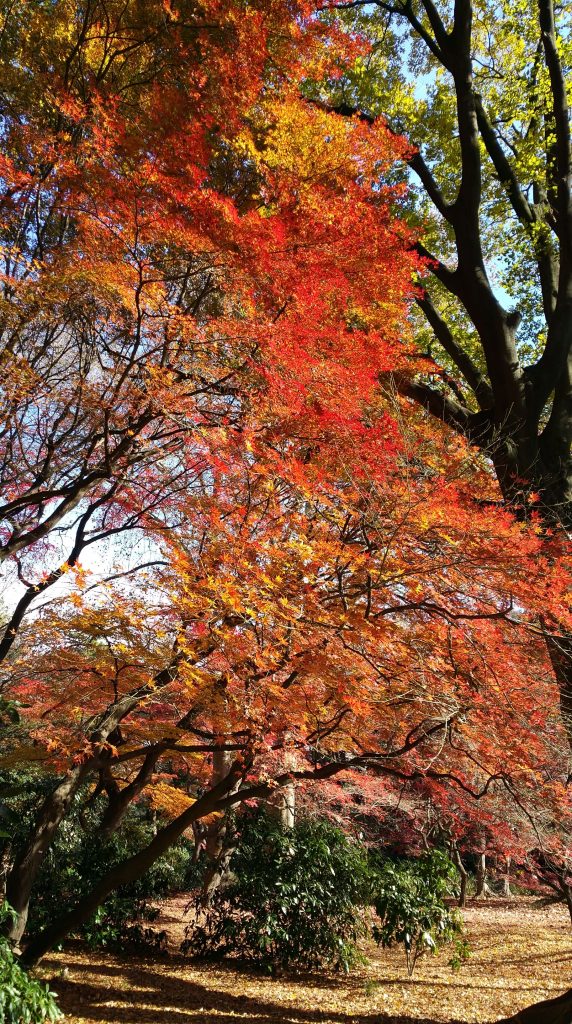 Anyhow, we followed his directions (which was rather like a shortcut somewhat that involved walking in backalleys and small streets in a residential area in front of people’s homes), passed by several vending machines that were randomly erected on the streets (I really had no idea Japan had so many vending machines everywhere), and finally we reached Shinjuku Gyoen Sendagaya gate. We paid for the admission (yup, it’s not free), grabbed a complimentary map in English and proceed to stroll along the pathways. It was still quite early in the morning, like around 9.30am when we reached, so there really wasn’t many people around. It was cold (as usual) and windy, but it was a rather surreal experience walking in this huge national garden. They’ve thoughtfully curated slightly different themed gardens and landscapes, but all still rather “Japanese”. I had thought initially that since winter came early in 2016, we might see all dreary and leaf-less trees, but lo and behold, we saw koyo! Autumn leaves! It’s just a small part of the garden that still have koyo, but the vibrant colours still blew me away.