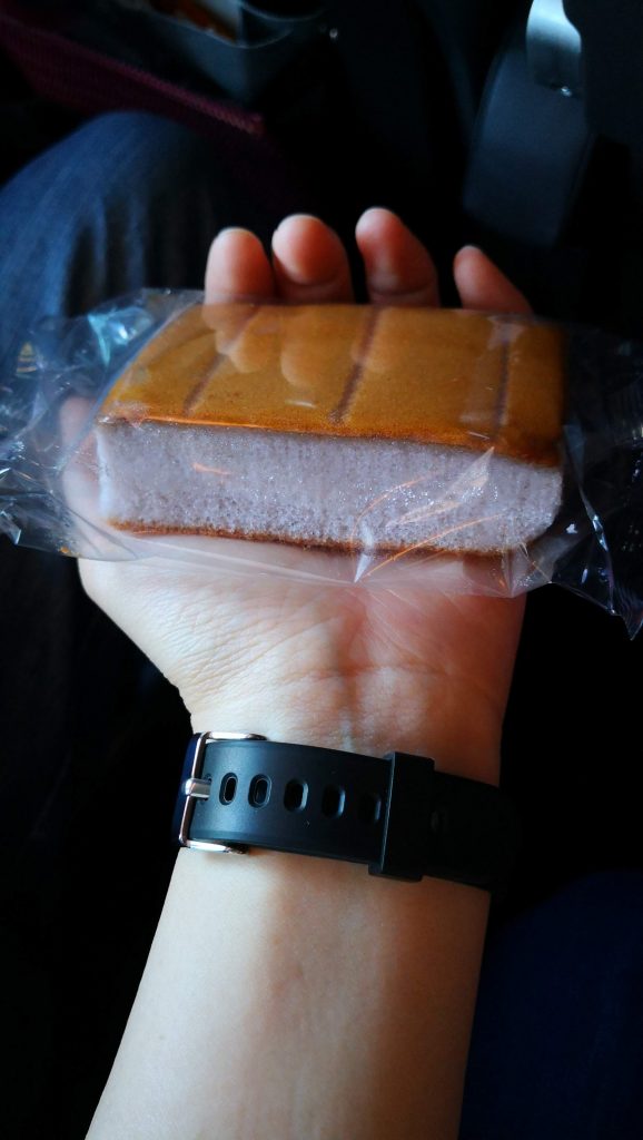 In the middle of the flight, they served yet another snack – this time it’s sponge cake. From the picture, it looks like purple right? Almost like sweet potato… but ultimately I think it was green tea flavour.. haha. It looked pretty plain, but it’s oh so soft and heavenly! I loved that sponge cake so much. How I wish I could buy it…