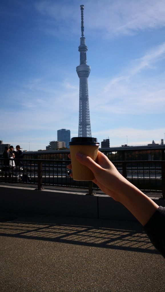 We left the hotel after eating our breakfast (yes Bruno ate the banana boat cake too), and our itinerary today was just Sumida Aquarium and Tokyo Solamachi. We slowly strolled along the Sumida River, popping by Cafe WE for coffee to-go. We basked in the sun while drinking the coffee and watching the skyline on the opposite side of the river (a.k.a. the Skytree). Bruno then had this typical touristy idea to take a photo of the coffee and the Skytree…. We tried so many times but failed – this is one of the better shots already. Not easy to try and take pictures with the sun shining straight in your eyes, you know…